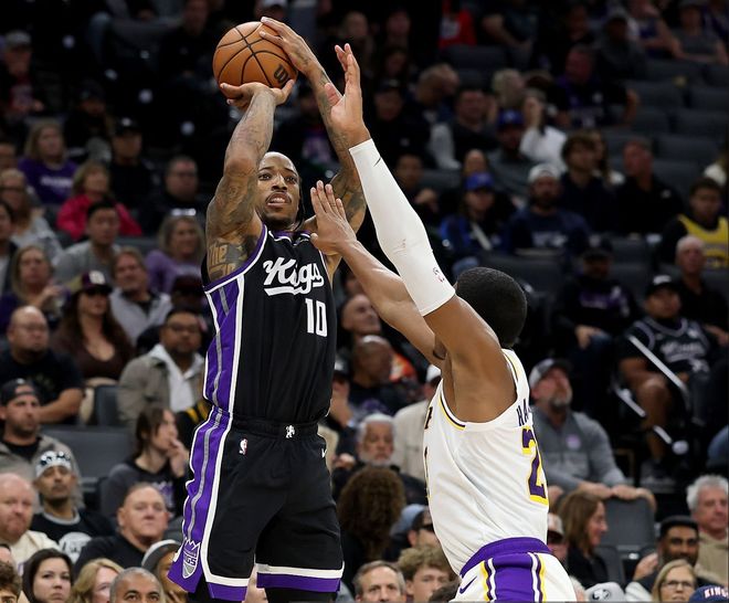 本場比賽,德羅贊出戰(zhàn)40分鐘,投籃22投9中,三分6中2,罰球1中1,貢獻21分6籃板3助攻1搶斷。