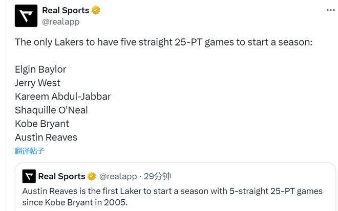 里夫斯又創(chuàng)造了一系列神跡。他在前5場(chǎng)比賽砍下171分50助攻,成為湖人隊(duì)史首位在賽季前5場(chǎng)比賽得到至少150分50助攻的球員。里夫斯開季連續(xù)5場(chǎng)比賽砍下25+,是湖人自2005年科比后首人!同時(shí)是湖人隊(duì)史第6位做到的球員,比肩貝勒、韋斯特、賈巴爾、奧尼爾、科比。